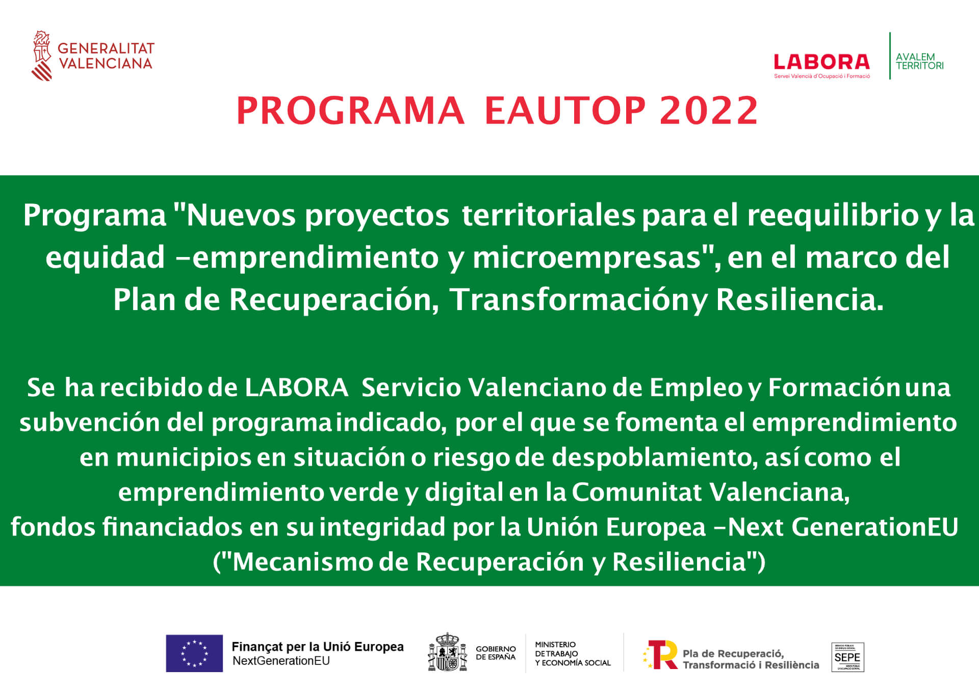 Se ha recibido de LABORA Servicio Valenciano de Empleo y Formación una subvención del programa indicado, por el que se fomenta el emprendimiento en municipios en situación o riesgo de despoblamiento, así como el emprendimiento verde y digital en la Comunitat Valenciana, fondos financiados en su integridad por la Unión Europea – Next GenerationEU («Mecanismo de Recuperación y Resiliencia»)