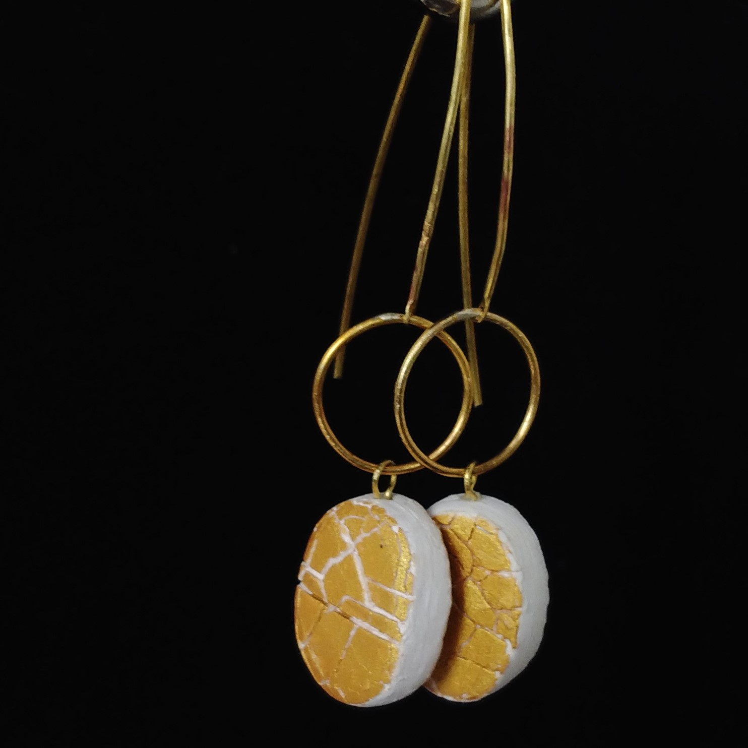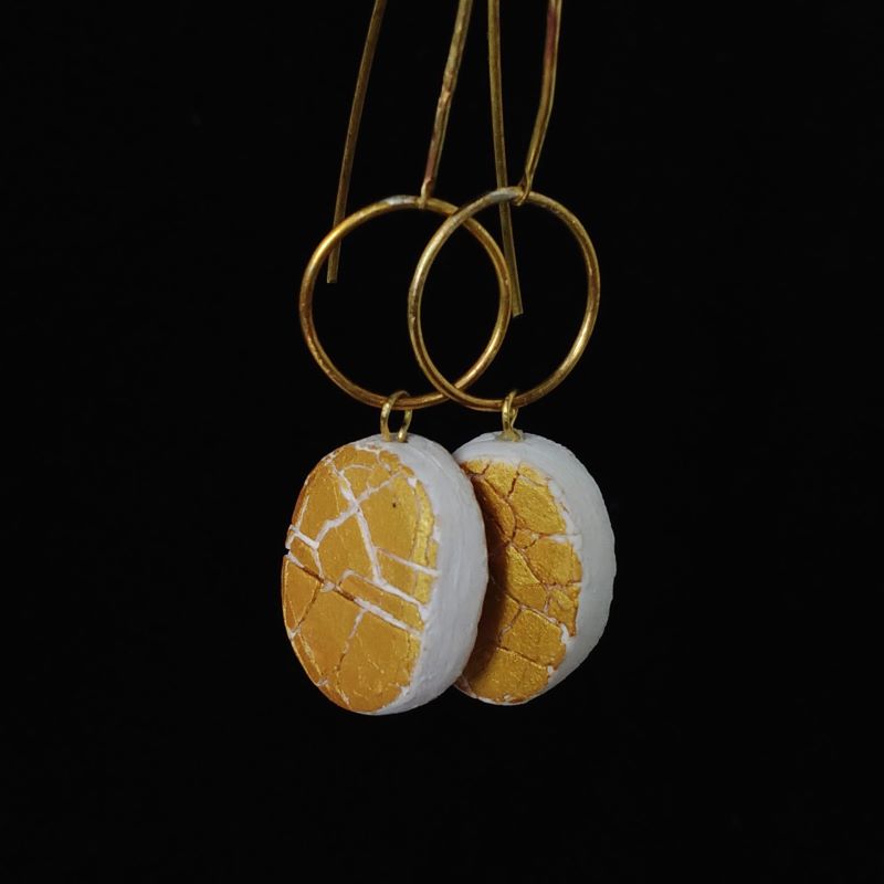 GRIETAS DORADAS – Cuando la luz necesita más espacio Hay grietas por las que la luz se cuela con fuerza. Este pendiente es para esos días. Pertenece a Grietas Doradas, la línea más luminosa de mi colección inspirada en la sequía y la belleza que surge de la tierra agrietada. Porcelana suave, brillo dorado, movimiento. La pieza tiene más presencia que el modelo pequeño, sin perder un gramo de delicadeza. Hecho a mano: - Porcelana de baja temperatura, modelada pieza a pieza - Enganche dorado y aro de latón Medidas: - Largo total: 7 cm - Ancho del motivo de porcelana: 1.5 cm Cuidados: - Porcelana delicada: evita golpes, agua, perfumes - Limpia con paño seco - El latón puede oscurecerse (pulir suavemente con un paño para metales para recuperar color) Para días en los que quieres que te noten, pero con estilo. ¿Te gusta esta pieza?👉 Aprende a hacerla en el Curso Básico de Cerámica en Microondas y empieza tu viaje en este arte.